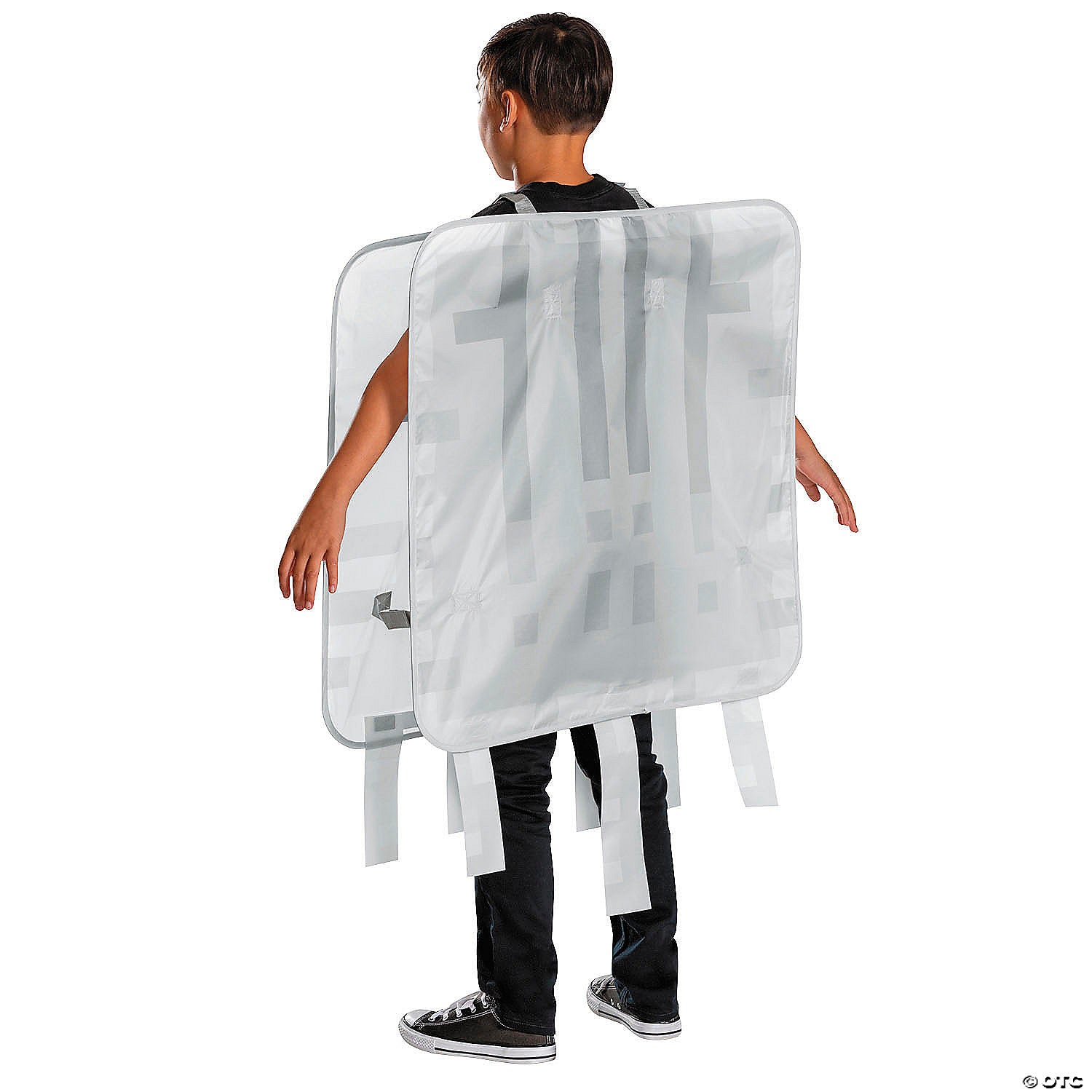 Our Ghast Pop-Out Costume has front and back wire-framed polyester panels that are attached at the shoulder. Just pop on over your own clothing for a great look. Unisize fits everyone 8 and up. Do not wash. Do not bleach. Do not tumble dry. Spot clean with damp cloth. Cool iron if needed. Do not dry clean.